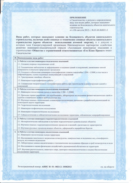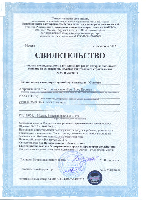 - «Ассоциация Инженерные изыскания в строительстве» СРО - Свидетельство о допуске к работам по выполнению инженерных изысканий 01-И-№0021-2от 10.08.2012г