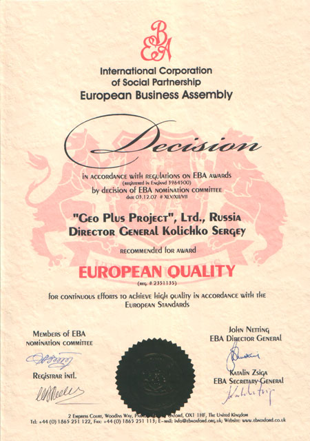 - Международная награда Европейского Качества., № 2351135 2007г.