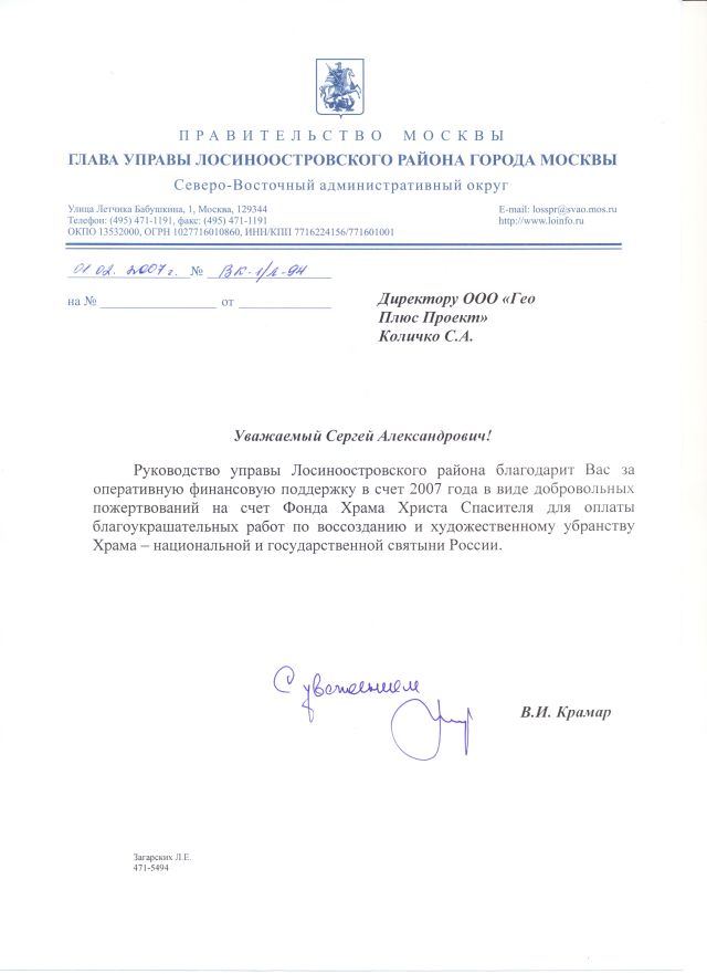 Благодарность за оперативную финансовую поддержку в виде добровольных пожертвований на счет Фонда Храма Христа Спасителя для создания благоукрашательных работ по воссозданию и художественному убранству Храма - национальной и государственной святыни России.
