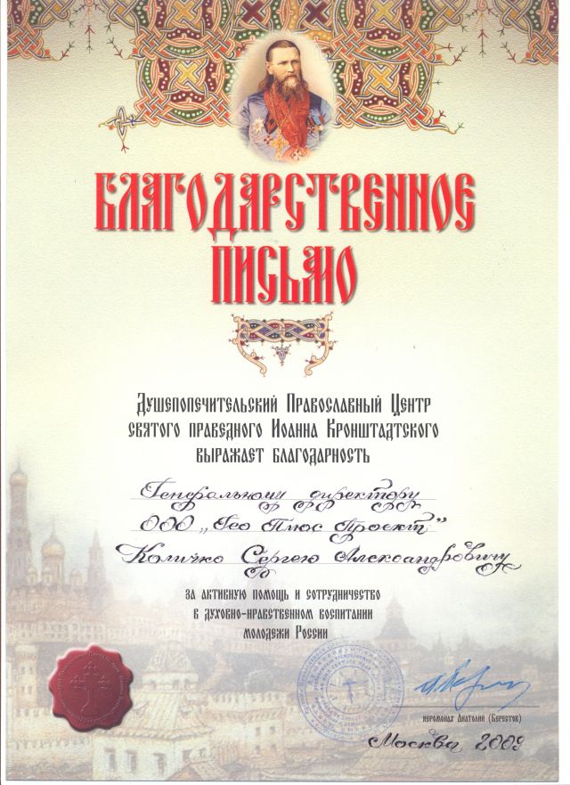 Благодарственное письмо за активную помощь и сотрудничество в духовно-нравственном воспитании молодежи России.